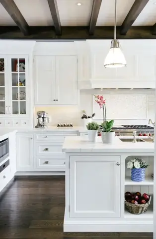 This modern kitchen perfectly blends soft white and gray hues to create a serene, welcoming atmosphere. A large window fills the space with natural light, highlighting the elegant gray cabinetry and crisp white countertops. A vase of pink flowers on the countertop adds a refreshing touch, while the sink seamlessly integrates into the gray surface. Positioned under the window, the oven benefits from an abundance of natural light, making cooking a bright and enjoyable experience. The matching laminate floor completes the look, ensuring a cohesive and stylish design. Ready to update your kitchen with this elegant, light-filled style? Let us help you transform your space into a modern masterpiece.